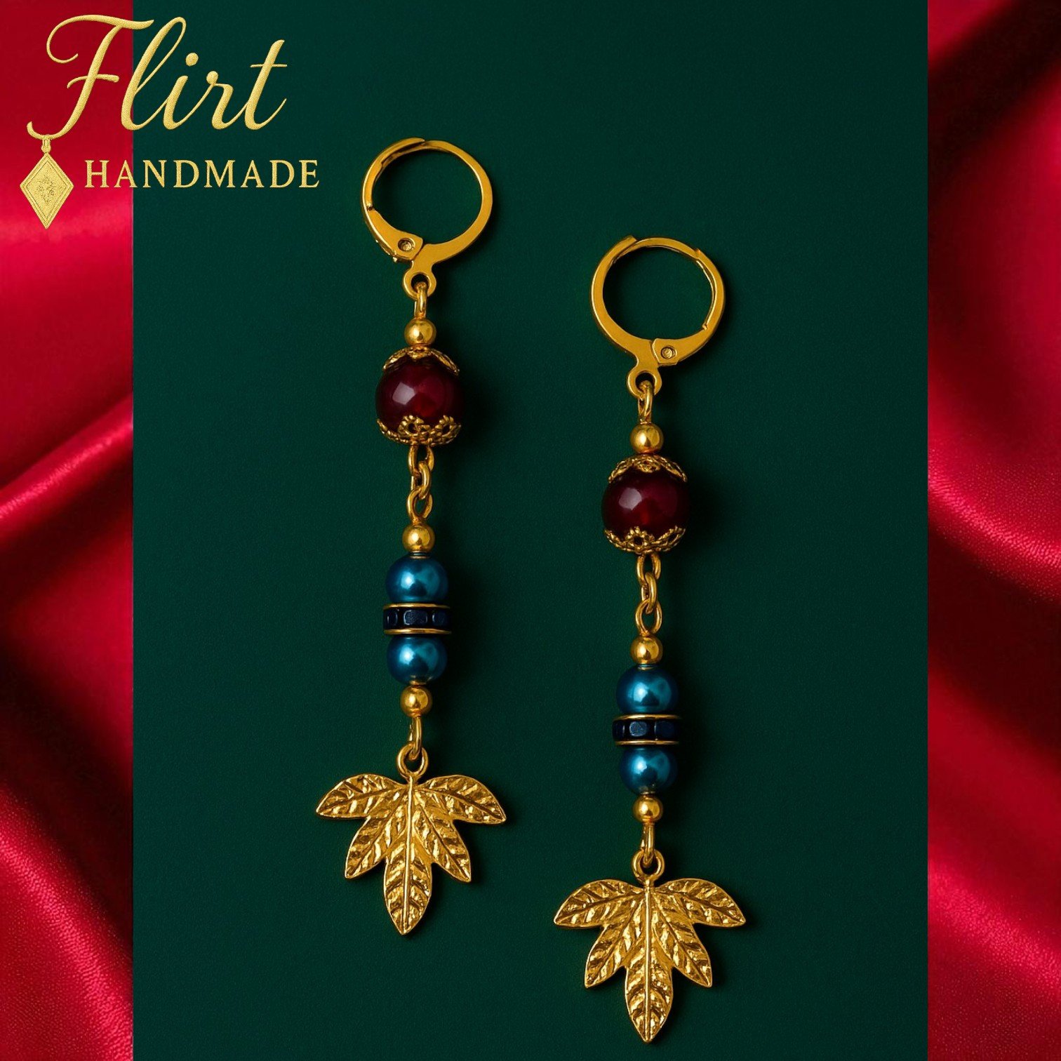 🪙 Material: Gold-plated charm leaves, teal glass pearls, crimson jade bead, gold-toned hematites, stainless steel hooks.