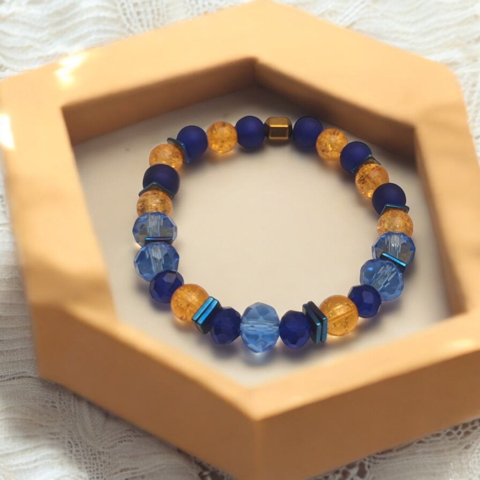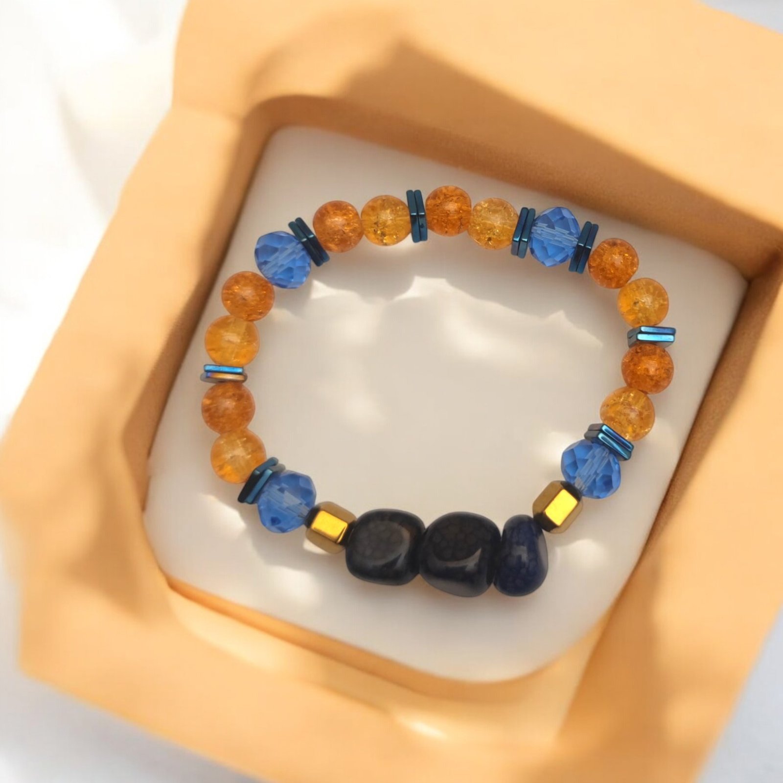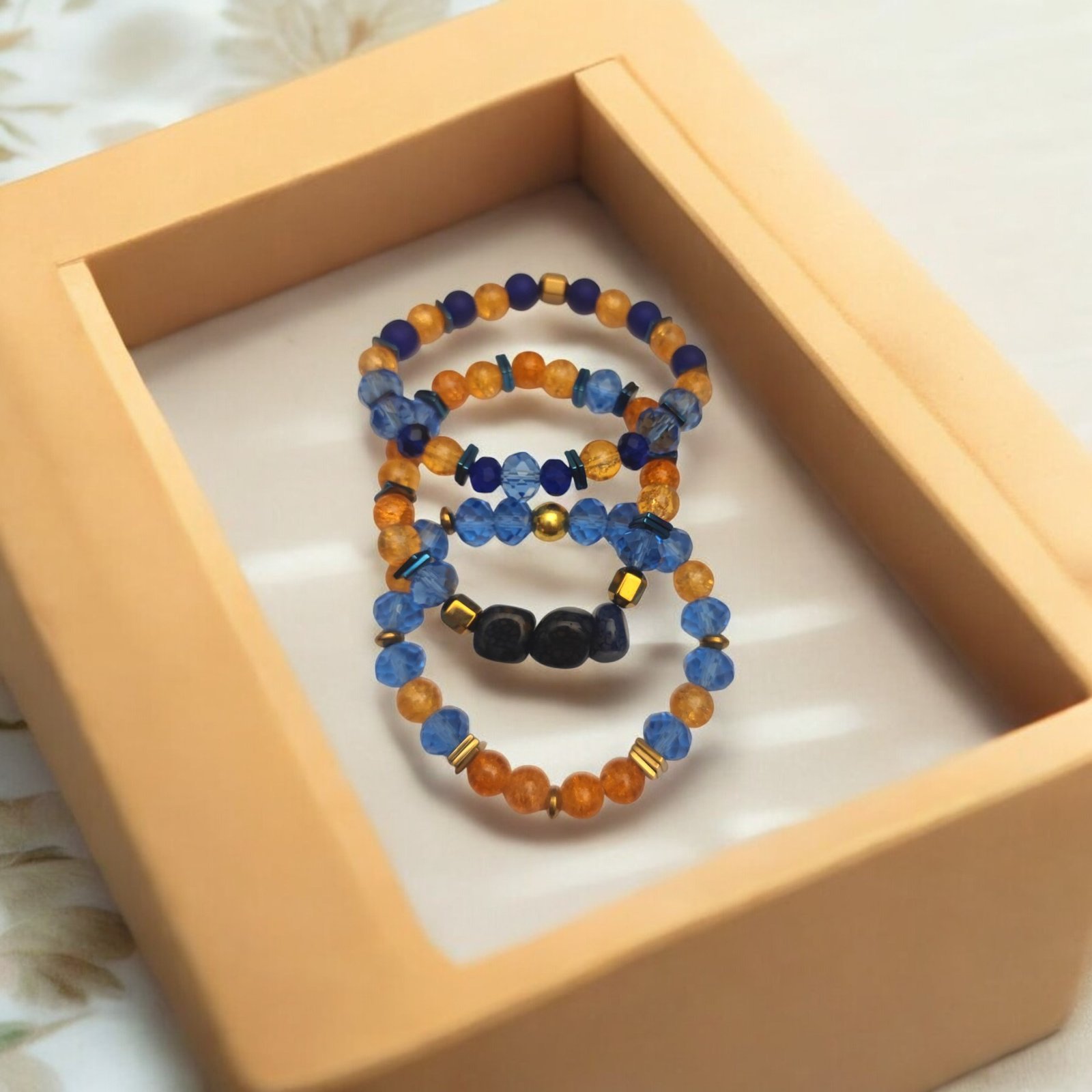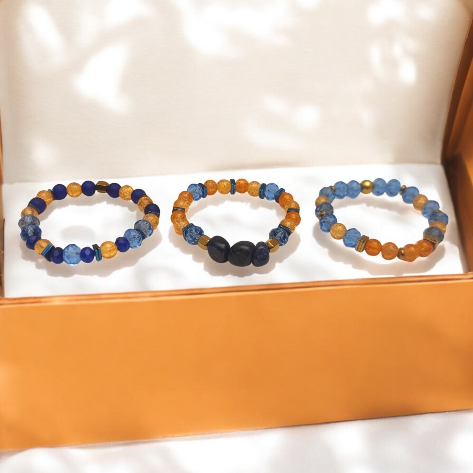 🌅 Elemental Color Story: This trio features Natural blue-toned marble beads as a centerpiece for balance and style, blue crystal beads for classy shine, shiny glass beads with rich blue and ember tones, and blue and gold hematite bead separators.