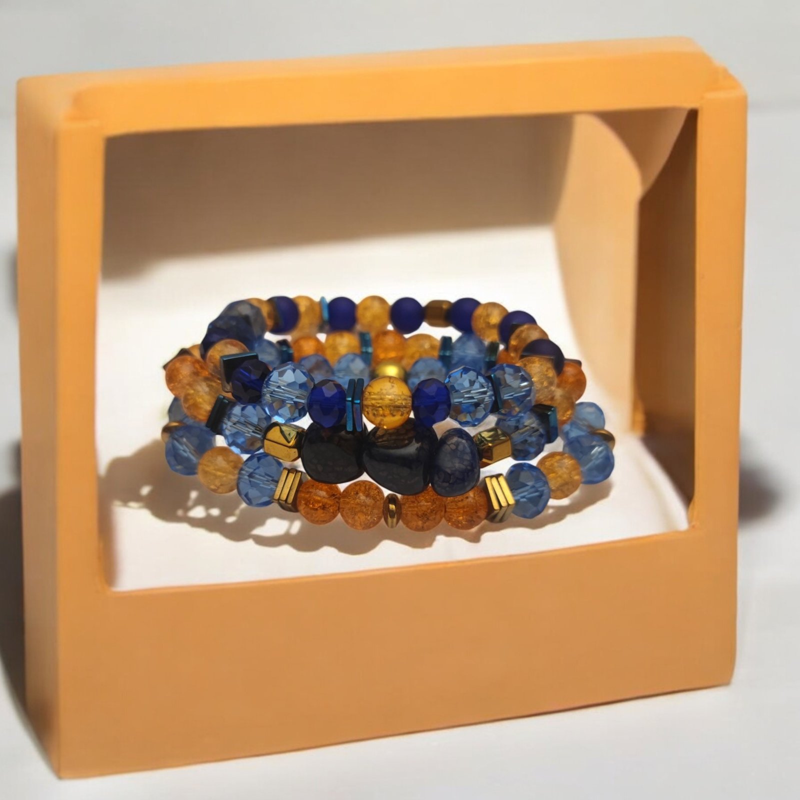 Welcome to Flirt Handmade, your oasis of soulful, handcrafted jewellery made with love in Egypt. Let the Blue Ember Trio Set ignite your style with a mesmerising dance of cobalt blues, golden amber, and deep onyx — inspired by the contrast of desert twilight and blazing sunsets.