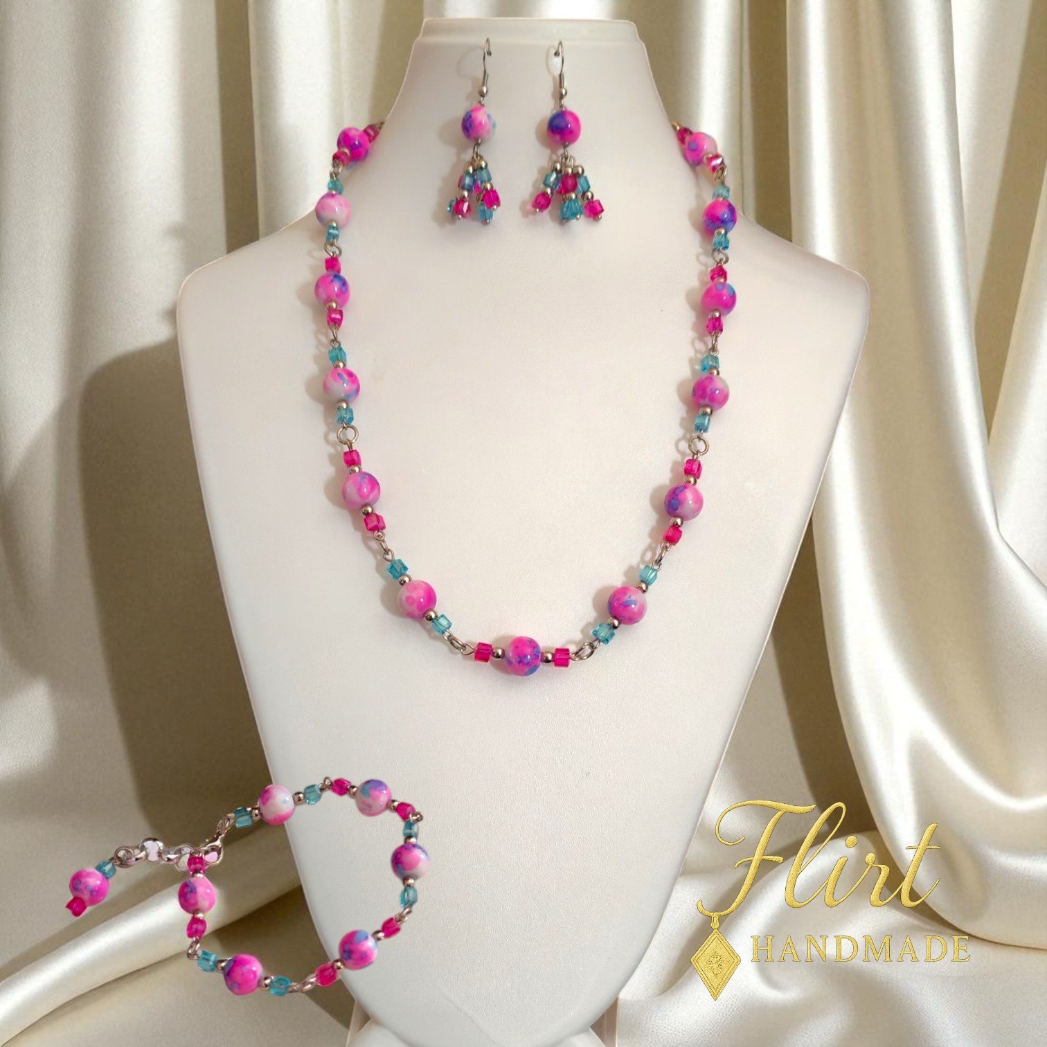 🌈 Pastel Perfection: Featuring swirls of pink, magenta, and ocean blue glass beads, this set brings joy in every hue.