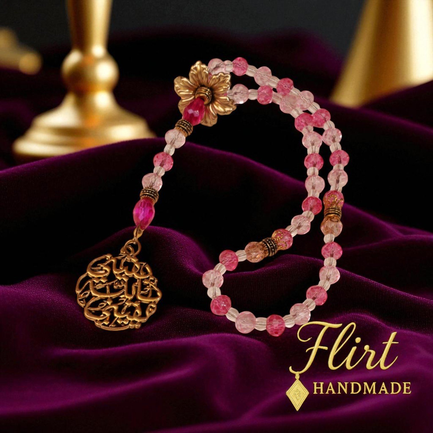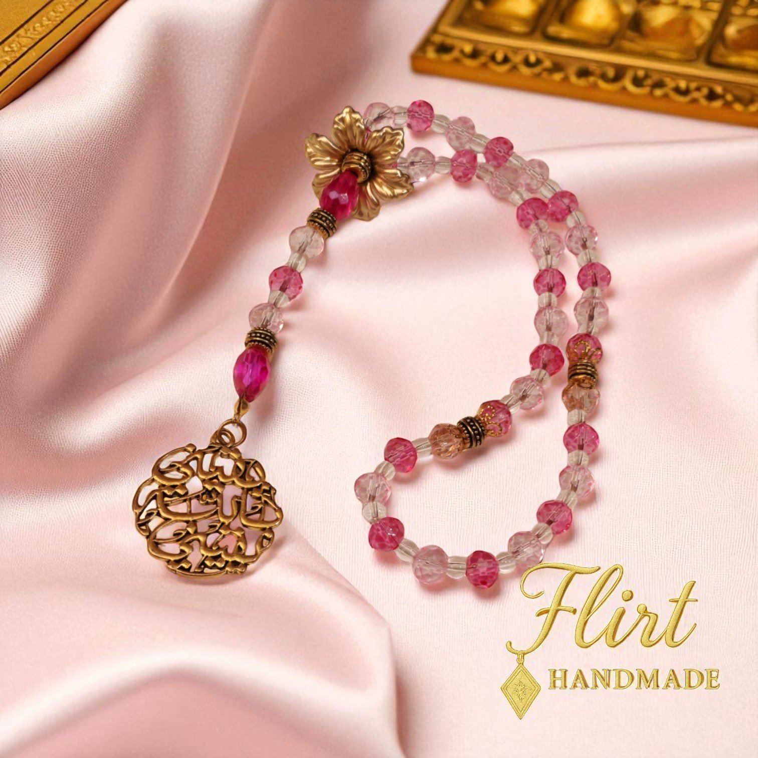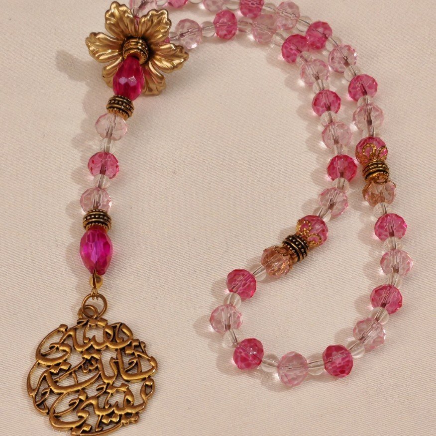 - Material: dark and light Pink faceted crystal beads, clear glass beads, gold-toned acrylic flower, filigree gold-toned pendant يقيني بالله يقيني, and brass rondelle separators.