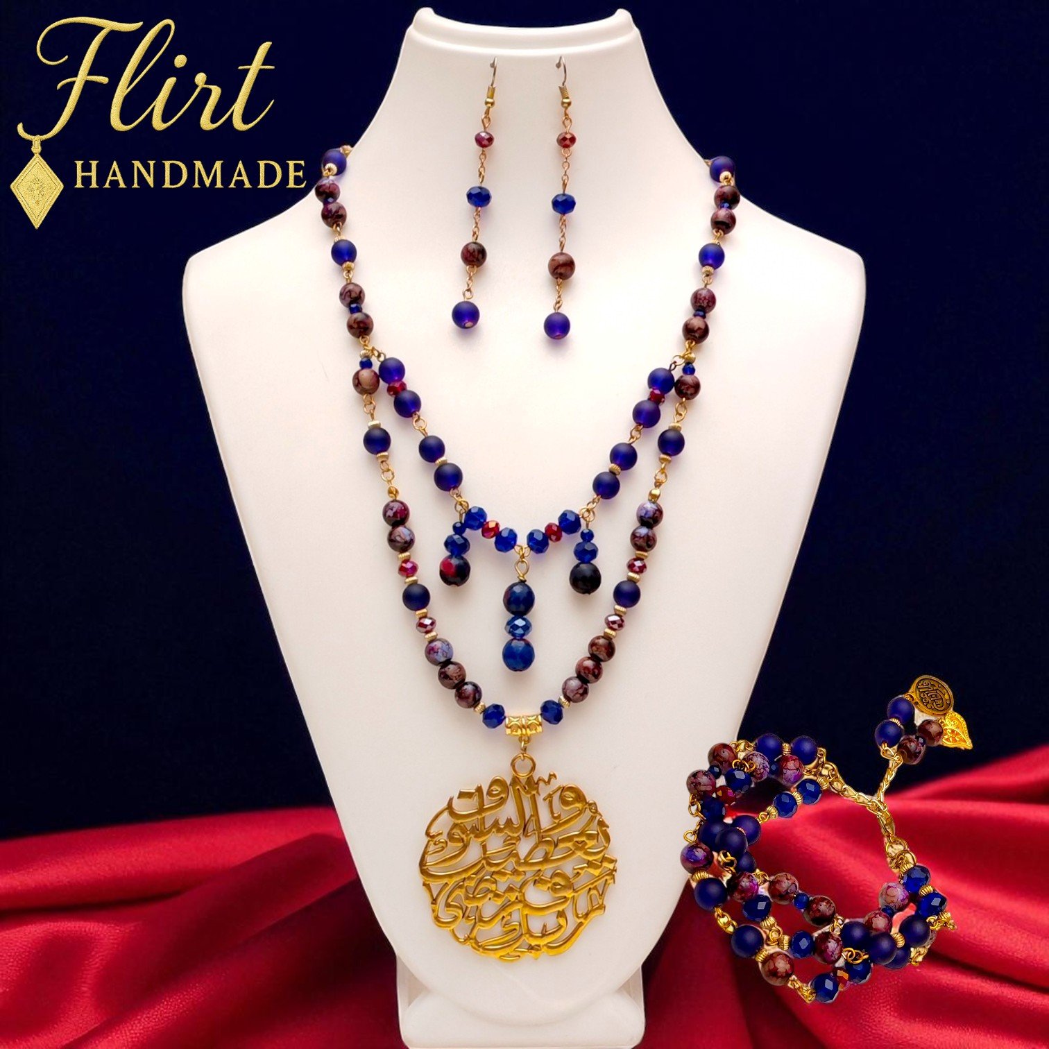 From the heart of Egyptian craftsmanship comes the Eternal Serenity Set — a breathtaking harmony of rich tones and spiritual elegance. Handcrafted with deep matte navy, cosmic purples, and a radiant Arabic calligraphy pendant in gold, this set is a poetic tribute to peace, strength, and beauty.