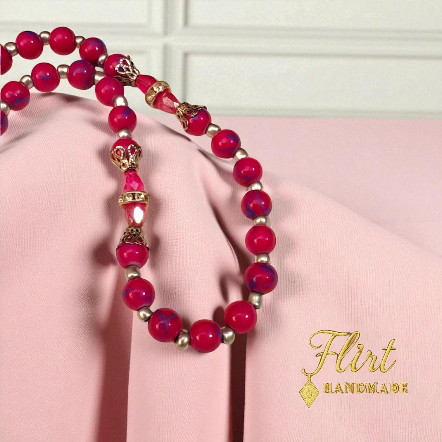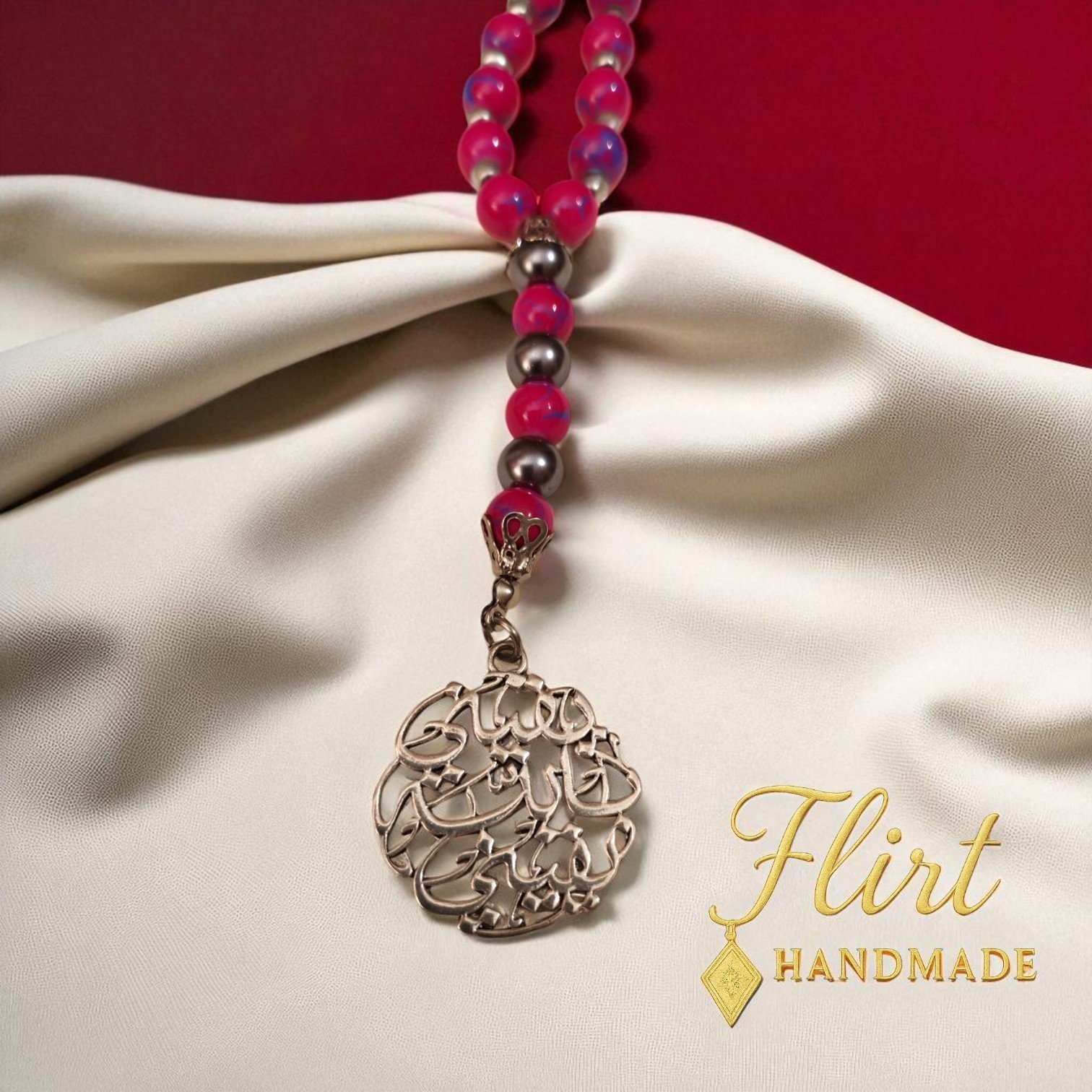 • Material: marbled Fuchsia and blue glass beads, teardrop fuchsia crystals, crystal disk spacers, silver seed beads, hematite beads, silver-toned metal islamic charm يقيني بالله يقيني.