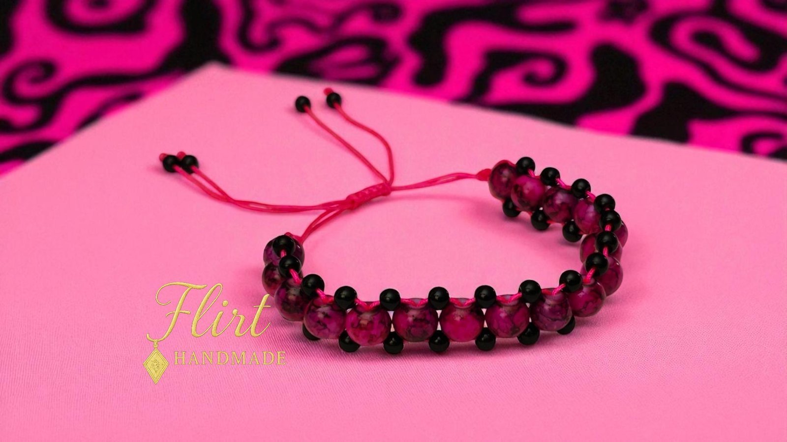 - Material: Marbled fuchsia beads, polished black beads, and a matching pink macrame cord.