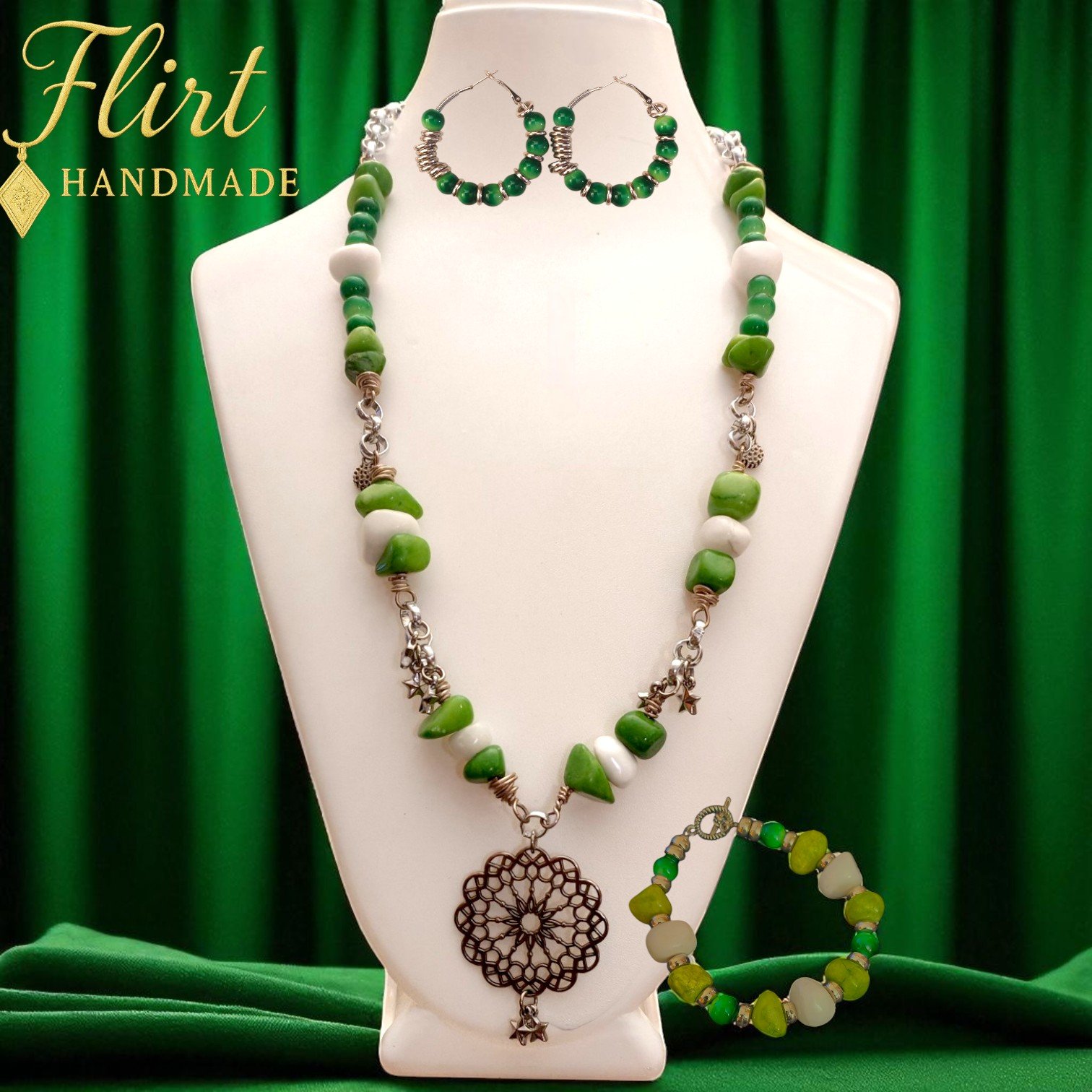 Welcome to Flirt Handmade, your go-to destination for handcrafted jewellery made with passion in Egypt. Embrace nature’s beauty with our Green Earth Charm Set, a vibrant tribute to lush landscapes, springtime joy, and timeless grace.