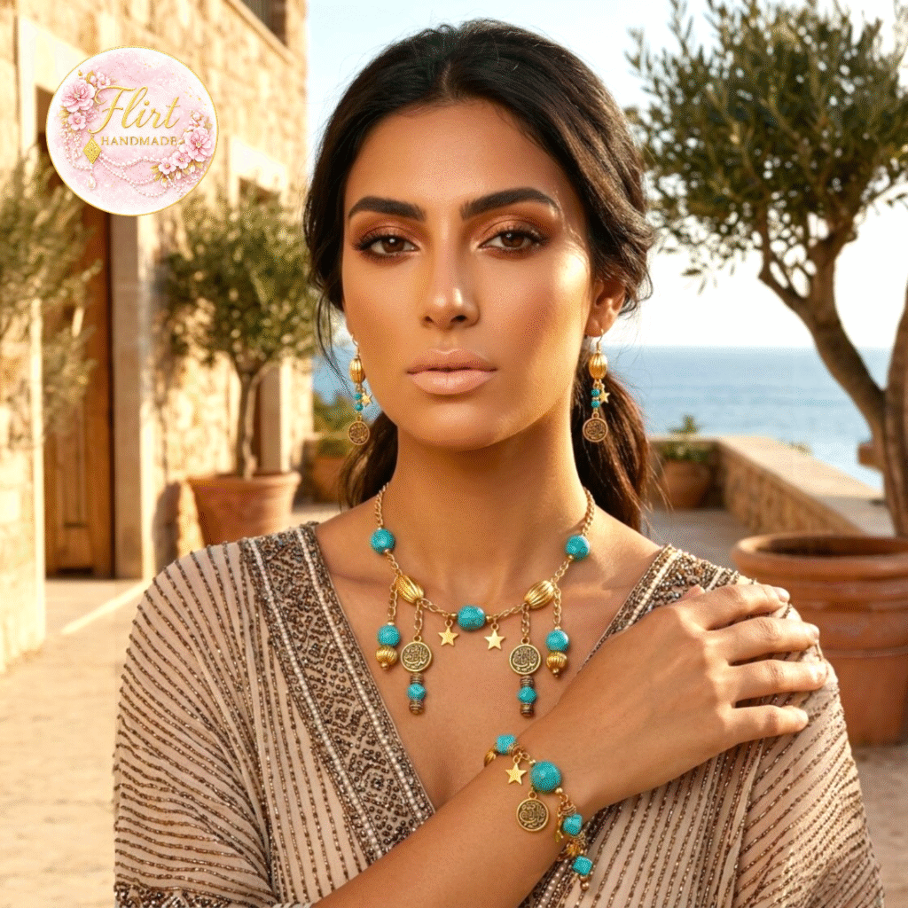 Inspired by the harmony of golden sunlight and turquoise skies, the Luna Oasis Jewelry Set captures a perfect balance between elegance and vibrant charm. This handcrafted set combines rich gold tones with refreshing turquoise stones, creating a design that feels both luxurious and uniquely eye-catching.