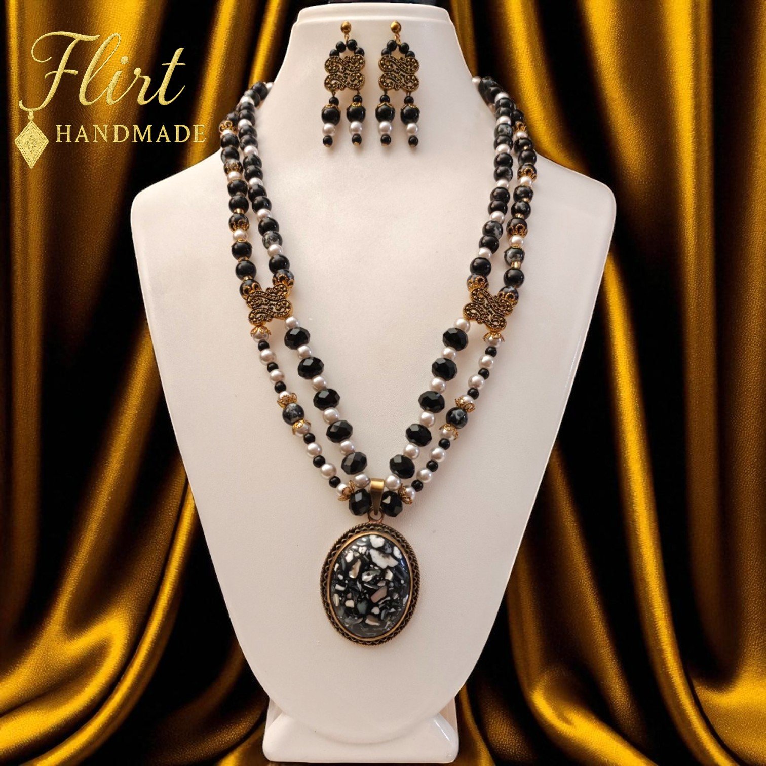 🔹 Material: white glass pearls, black glass beads, faceted black crystals, white marbled black jasper beads, gold-toned alloy filigree, brass-framed natural marbled stone.