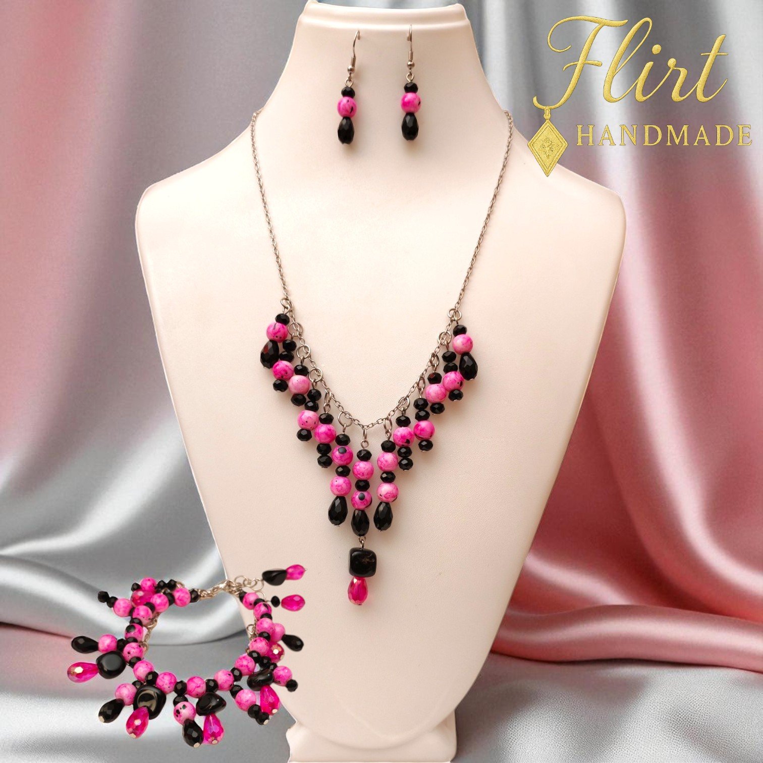 🌹 Striking Design: Featuring vivid fuchsia teardrop crystals and jade beads along with deep black teardrop crystals and agate beads arranged in cascading tiers, this necklace is made for glamour. The set includes matching dangling earrings and a double-strand beaded and dangling bracelet to complete your regal ensemble.