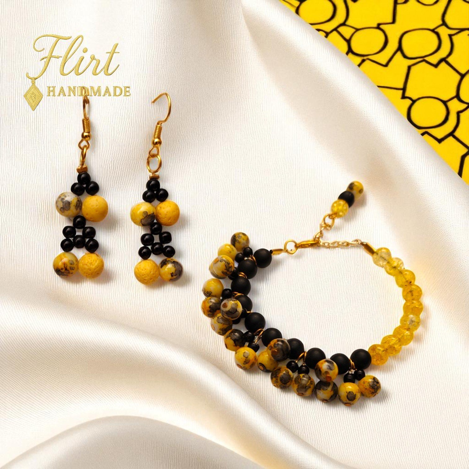 “Midnight Sun 🌙☀️ – A bold handmade set with golden yellow and deep black beads, blending sunshine warmth with midnight elegance. Includes bracelet & earrings for a radiant day-to-night look.”