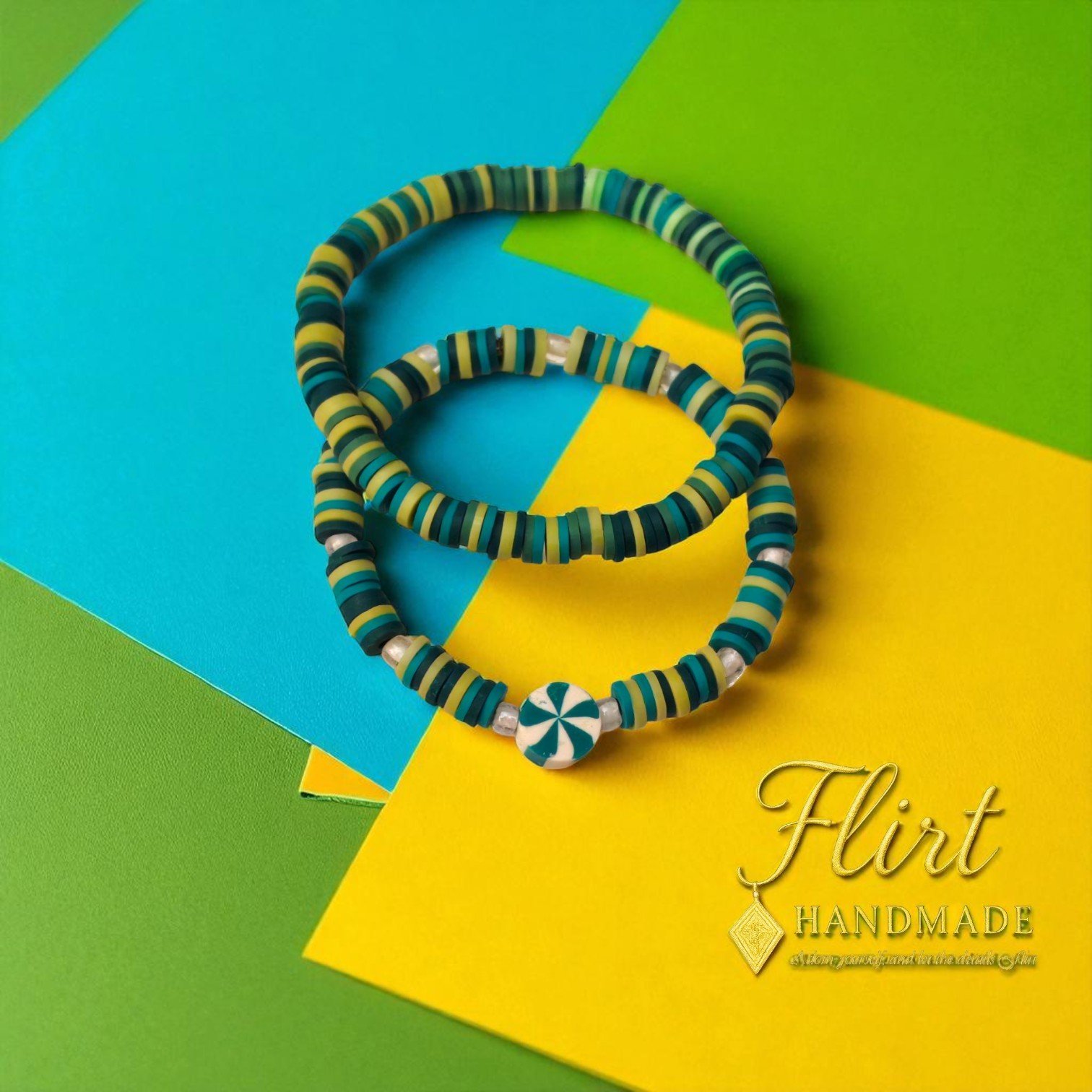 A cool and refreshing duo of bracelets, featuring a mix of mint green, teal, and yellow polymer clay beads. One bracelet is a solid stack, while the other is accented with a unique white and green candy-swirl bead for a sweet, playful touch.