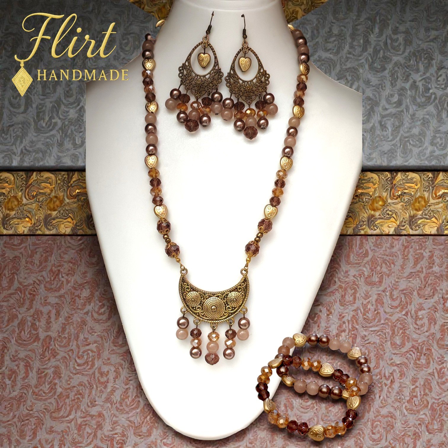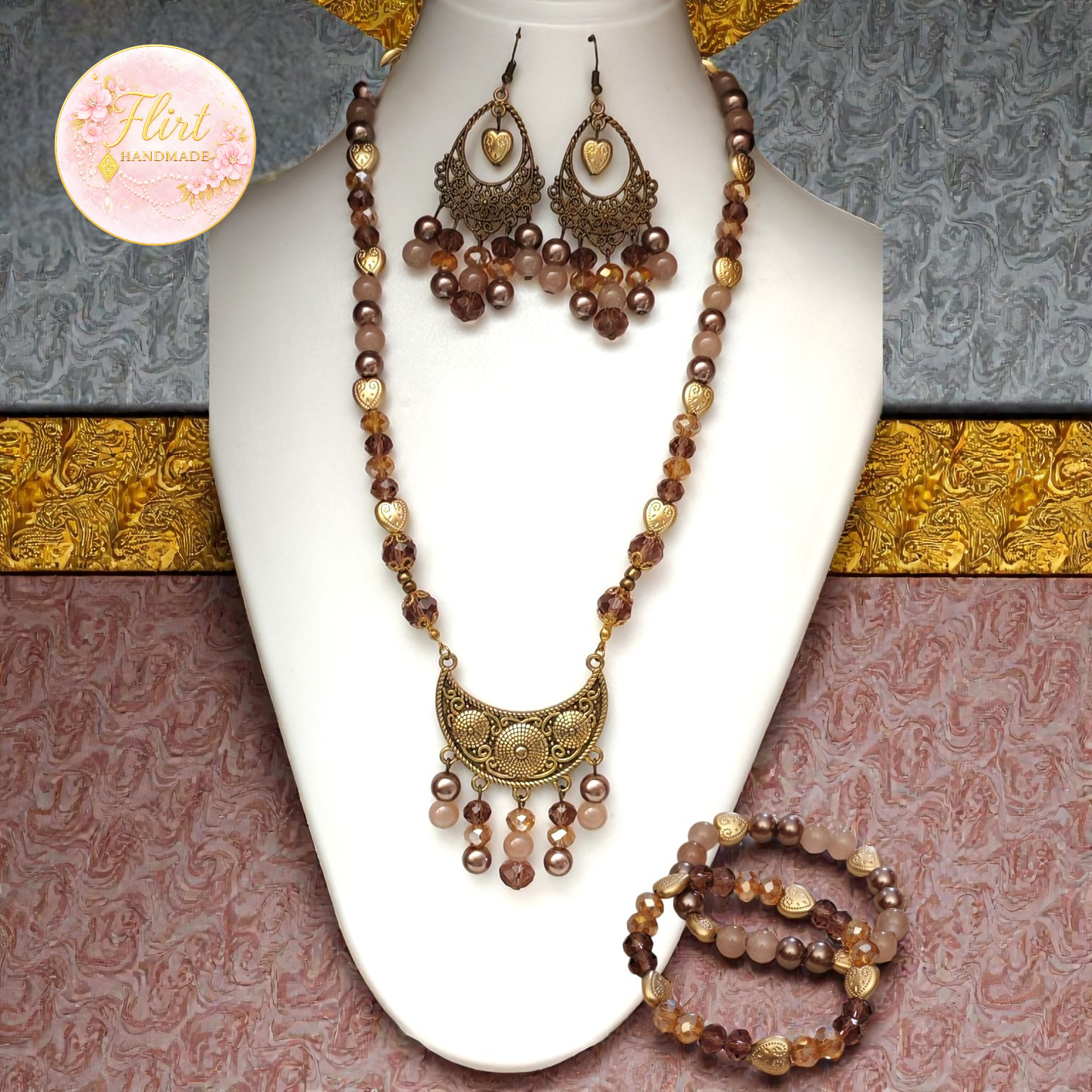 Handcrafted piece by piece, this set features a harmonious blend of mocha-toned beads, soft neutrals, and antique gold accents, gently highlighted by heart details that symbolize love, warmth, and connection. The necklace flows gracefully with a statement pendant that adds character without overpowering, while the matching earrings and bracelets complete the look with effortless charm.