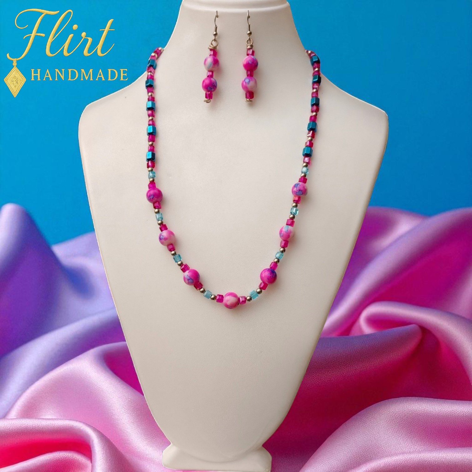 - Joyful Color Palette: A harmonious blend of rosy pink beads, some with unique marbled patterns, and striking teal-blue square beads creates a dynamic and cheerful aesthetic, perfect for brightening any outfit and lifting your spirits.