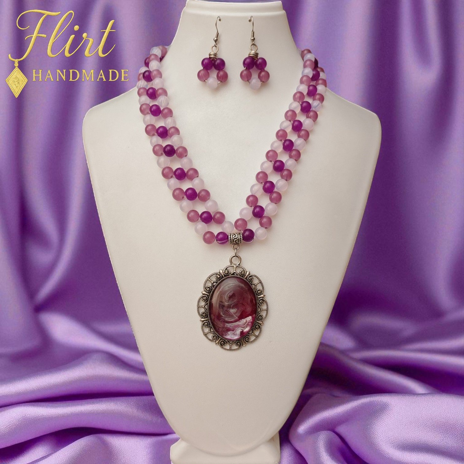 🔹 Material: violet shades of jade beads, silver-toned metal frame resin pendant.