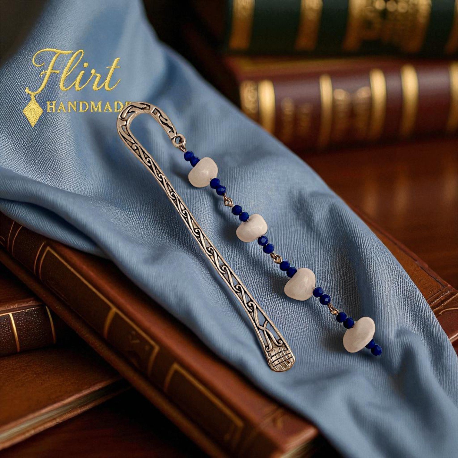 - Materials: silver-plated metal bookmark, smooth white natural stones, and vibrant faceted blue crystals.