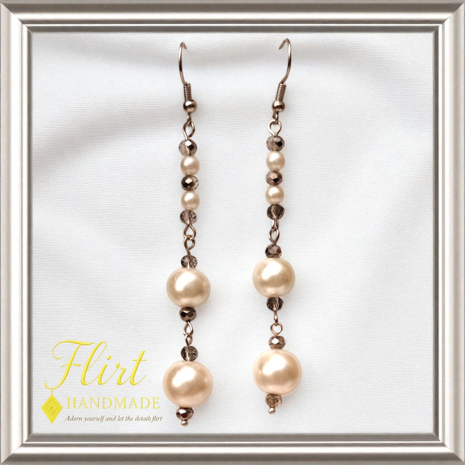 Soft Glow Dangles are a tender celebration of elegance and warmth. Handcrafted with luminous freshwater pearls and delicate, smoky, sparkling, faceted crystals, these earrings capture the quiet beauty of candlelight and the romance of a golden evening. Each bead flows gracefully in a cascading design, creating movement and shimmer with every turn of the head. Lightweight and versatile, they are the perfect adornment for both intimate dinners and grand occasions.